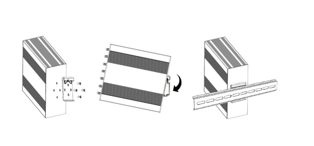 | Use 4pcs of M3x6 flat head phillips screws to fix the DIN-rail to the router. Insert the upper lip of the DIN-rail into the DIN-rail mounting kit. Press the router towards the DIN-rail until it snaps into place. | ![]() |