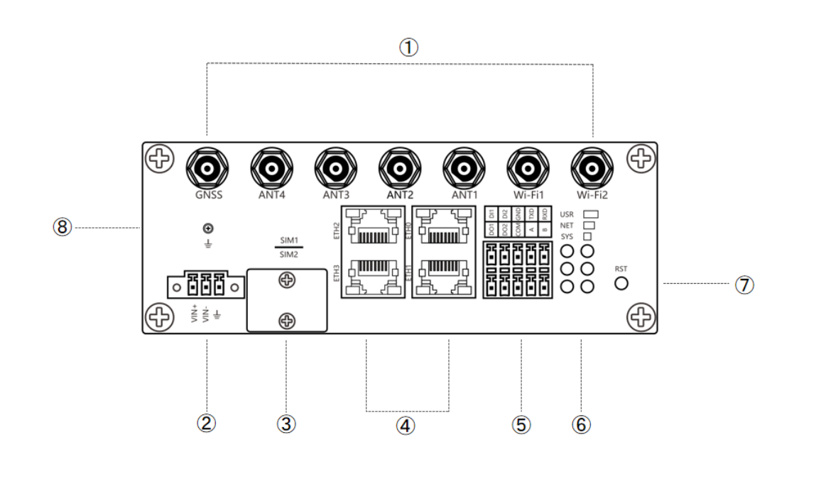 1 - Cellular, Wi-Fi, GPS Antenna 2 - MAIN Cellular AntennaPower Connector 3 - LED IndicatorSIM Card Slot 4 - Serial port & DIDOEthernet port 5 - Ethernet portSerial port & DIDO 6 - Wi-Fi AntennaLED Indicator 7 - AUX Cellular AntennaReset Button 8 - Grounding Stud |