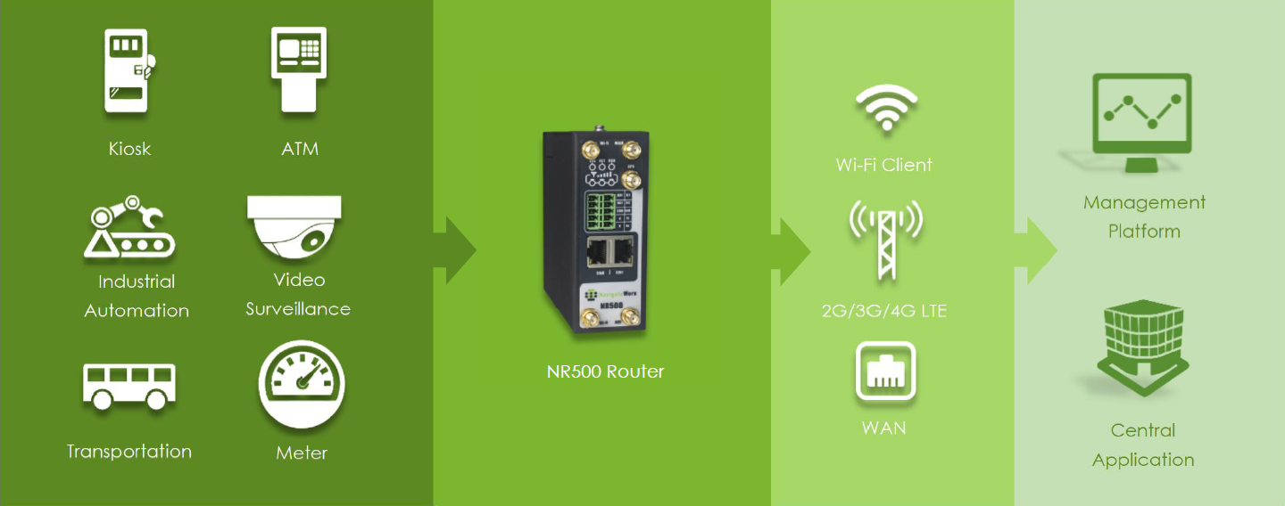 Navigateworx NR500 STD industrial cellular VPN router enables wireless data connectivity over public and private LTE cellular networks at 4G speeds.