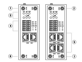1 - Wi-Fi Antenna 2 - MAIN Cellular Antenna 3 - LED Indicator 4 - Serial port & DIDO 5 - Ethernet port 6 - Wi-Fi Antenna 7 - AUX Cellular Antenna |