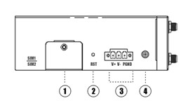 1 - SIM Card Slot 2 - Reset Button 3- Power Connector 4 - Grounding Stud |