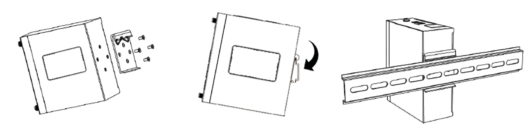 | Use 4pcs of M3x6 flat head phillips screws to fix the DIN-rail to the router. Insert the upper lip of the DIN-rail into the DIN-rail mounting kit. Press the router towards the DIN-rail until it snaps into place. | ![]() |