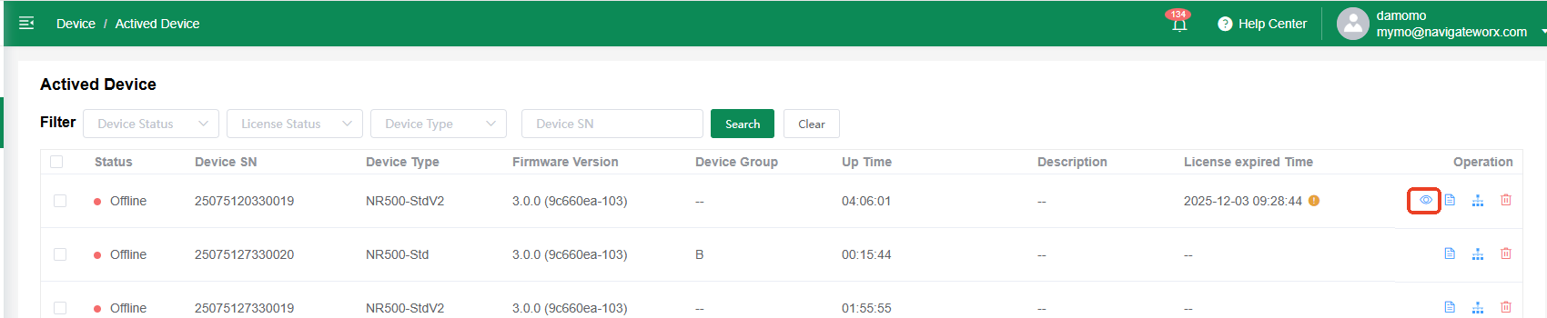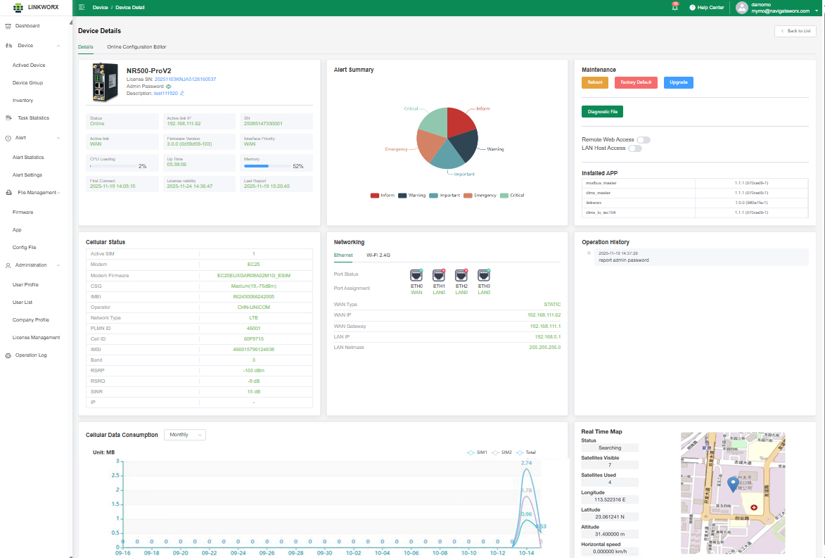 A device with an active license gains access to an advanced configuration interface. Within this interface, users can view detailed device information, monitor data statistics, access geographical location data (if the device is GPS-capable), and manage configuration files online.