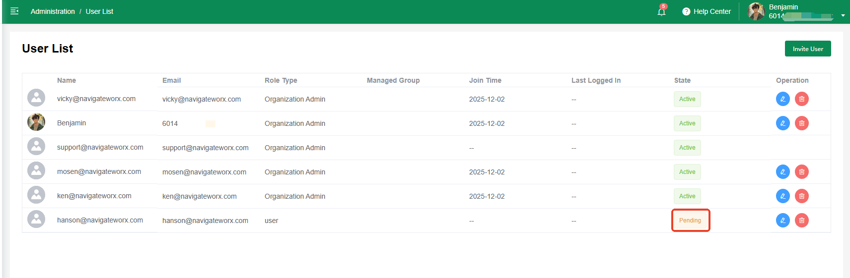 The User List provides Organization Admins with an overview of all users in the company. Organization Admins can invite new users, assign roles, manage permissions, and remove accounts. It ensures secure and organized user management within the organization.