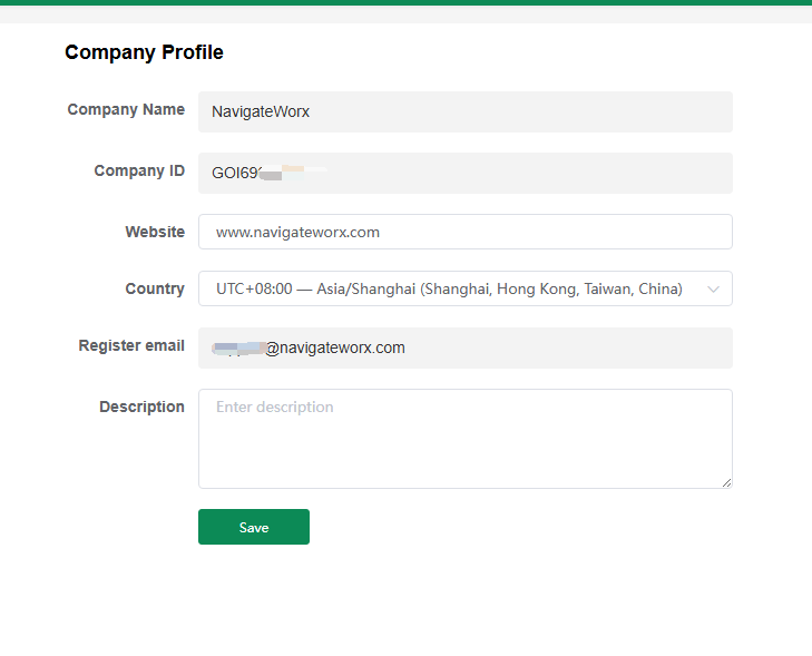 The Company Profile shows key company information such as organization name, website, and timezone. The first creator becomes the Organization Owner. Organization Admins can update company details and manage high-level business settings.