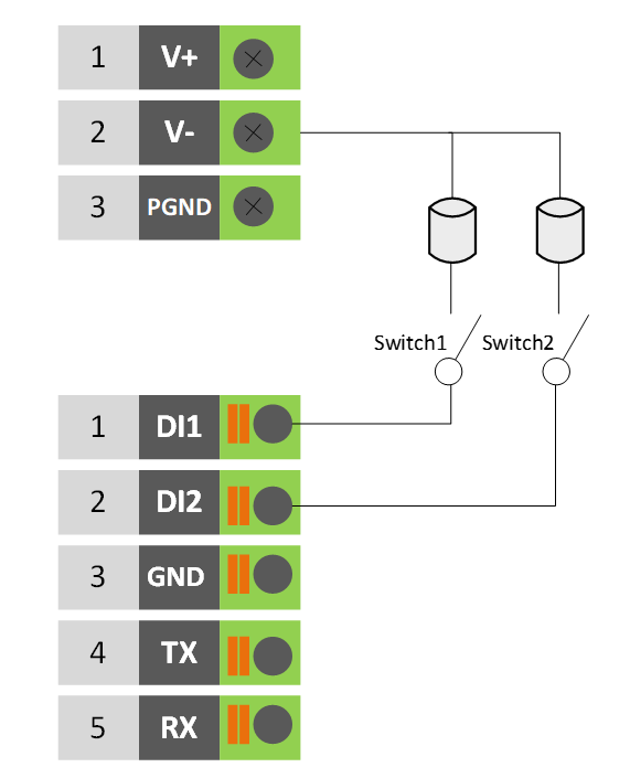 Dry Contact Typical Application Switch ON(Short to V-): DI Logic LOW Switch OFF(Open): DI Logic HIGH |