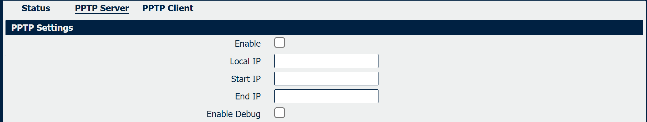 | Local IP | Specify the start IP address to be obtained for the PPTP clients. |