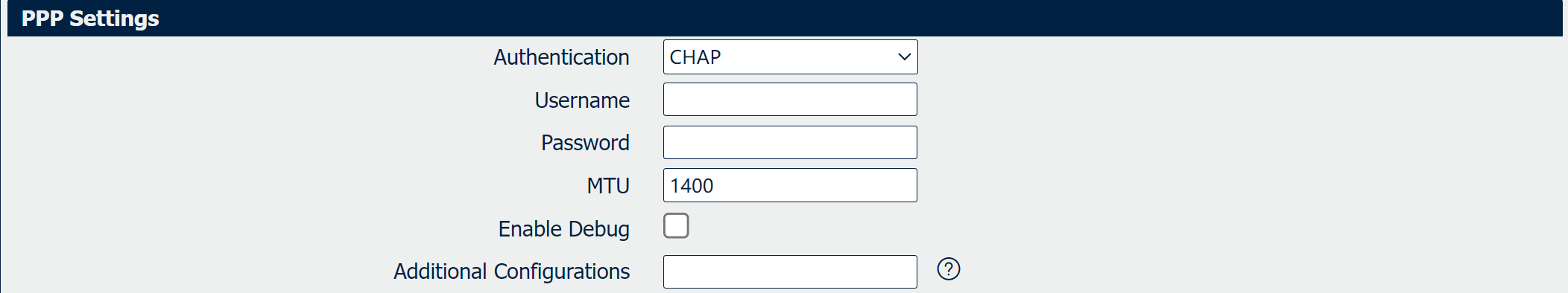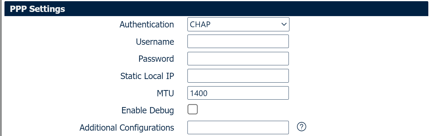 Select the authentication type, available options are “CHAP”, “PAP”, “MSCHAP_v1”, “MSCHAP_v2” and “None” |